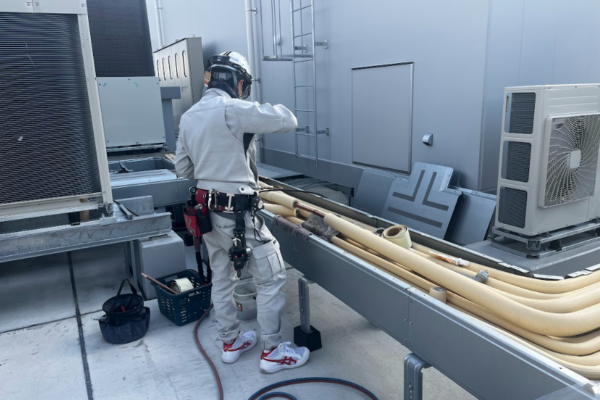 大型室外機に繋ぐ放送局屋上の配管溶接と結露防止施工